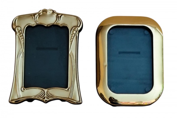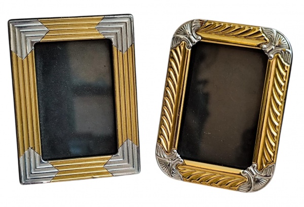 • Lote composto por 2 pequenos porta retrato em metal e vidro - 10x07 cm - e 07x4,5 cm a foto.