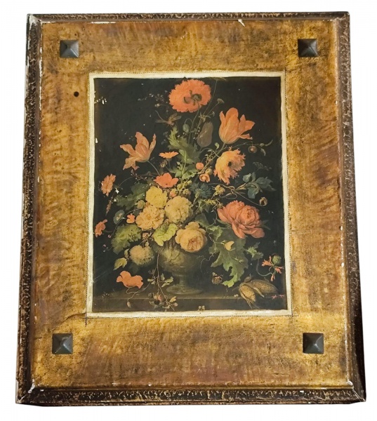 • Moldura em madeira pintada 42x35 cm - acompanha reprodução colada s/ papel - natureza morta - 26x20 cm - com desgastes na pintura e pequenos bicados na pontasnamoldura.