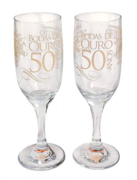 • Par de taças comemorativas em vidro - Bodas de Ouro 50 Anos - 19x05 cm.