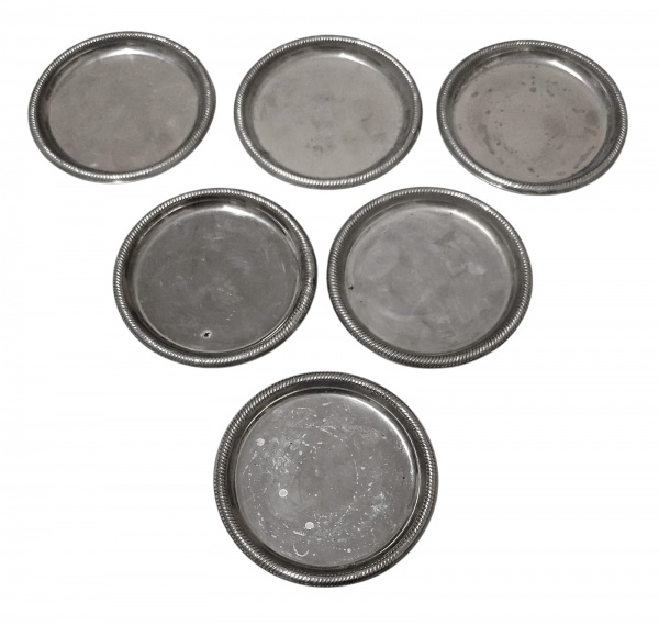 • Conjunto com 6 porta copos em metal - 10 diam - com riscos e desgastes do uso.