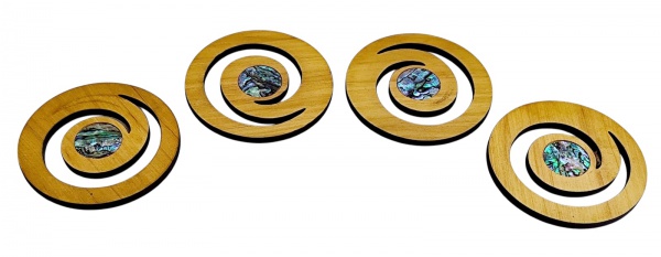 • Conjunto com 4 porta copos em madeira com acabamento em madrepérola e imã - 8,5 diam.