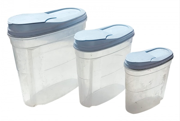 • Conjunto com 3 potes com tampa em plástico - 29x23x12 cm o maior - 24x22x09 cm o médio - 18x17x07 cm o menor - com marcas do uso e necessitando limpeza.