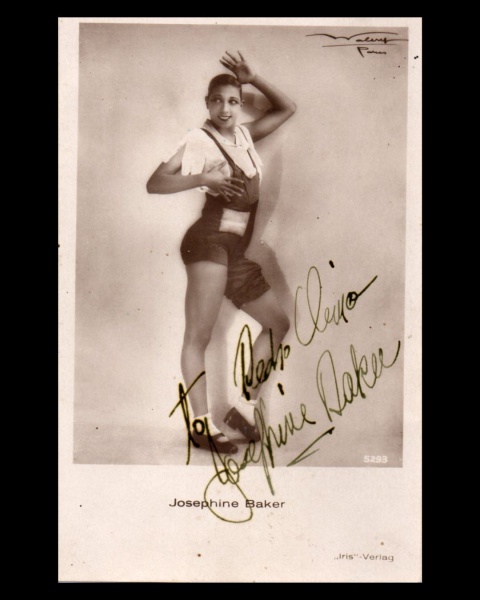 • cartão postal - Josephine Baker (dançarina, cantora, atriz e ativista americana que se naturalizou francesa, conhecida por sua carreira na França e por seu ativismo antirracista) - com dedicatória autografada - anotação no verso Cassino da Urca 1939 - bem conservado - (14x9)cm.