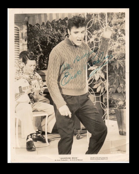 • fotografia - Elvis Presley - foto original autografada - still do filme Prisioneiro do Rock n Roll (1957) - pequeno rasgo no centro da margem direita com 2cm - verso com carimbo e informações manuscritas - (25,5x20)cm.