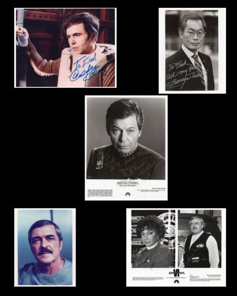 • fotografia - Star Trek V - lote com 5 fotos promocionais originais autografadas pelos artistas DeForest Kelley, James Doohan, Walter Koenig, Nichelle NicholsGeorge Takei e Calfer Koen - em perfeito estado de conservação - (20x25,5)cm.