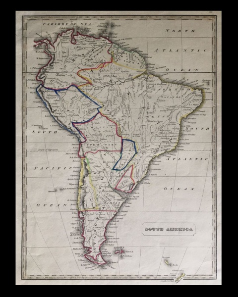 • mapa - South America  - papel levemente amarelado - lateral esquerda irregular - imagem (32X23,5) cm - com as margens (43,5X36,5) cm.