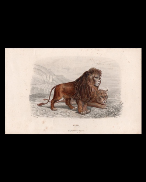 • litografias - O Leão - H. Gobin, del. - Imp. Lamoureux - Paquien, sc. - litografia original da obra `Historia Natural Illustrada` de Julio de Mattos - papel amarelado pelo tempo - (17,5x27) cm.