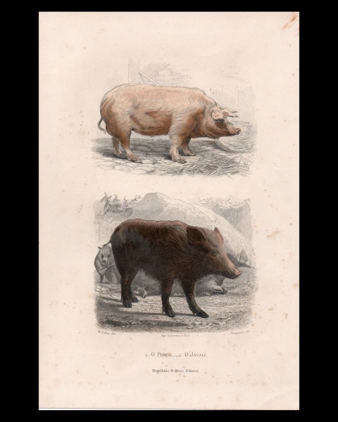 • litografias - O Porco - O Javali - H. Gobin, del. - Imp. Lamoureux - Paquien, sc. - litografia original da obra `Historia Natural Illustrada` de Julio de Mattos - papel amarelado pelo tempo - (26,5x17,8) cm.