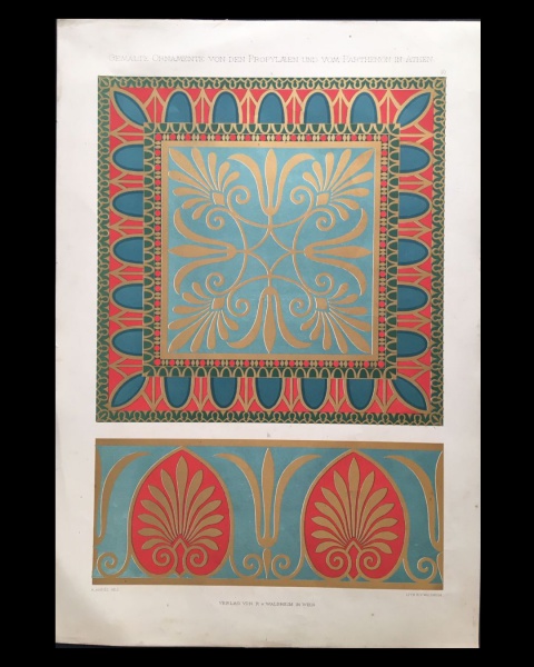 • litografia - Gemalte Ornamente von den Propylaen und vom Parthenon in Athen  - A. Andel gez. - Verlag von R. v. Waldheim - lith. R. v. Waldheim - litografia original da obra `Grundzüge der Ornamentalen Formenlehre` - (1880) - papel levemente amarelado - (43,3x29,5)cm.
