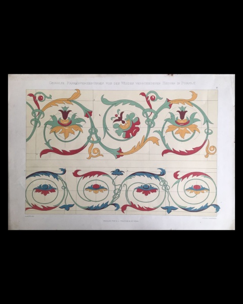 • litografia - Gemalte Rankenverzierungen von den Wänden verschiedener Häuser in Pompeji - A. Andel gez. - Verlag von R. v. Waldheim - lith. R. v. Waldheim - litografia original da obra `Grundzüge der Ornamentalen Formenlehre` - (1880) - papel levemente amareladocom pequenas manchas nas bordas - (29,5x43,3)cm.