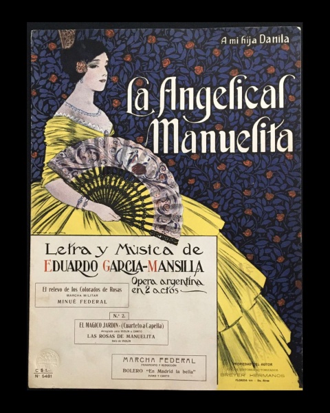 • partitura - La Angelical Manuelita - letra  música de Eduardo Garcia-Mansilla - Opera Argentina em 2 actos - Edición Breyer Hermanos  dos anos 20 - 7 p. - litografia com carimbo seco no canto inferior esquerdo da capa - em ótimo estado de conservação - (34,5X26) cm.