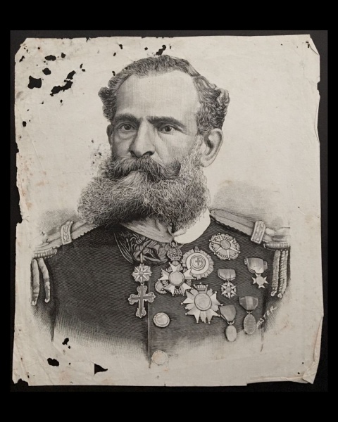 • gravura - Manoel Deodoro da Fonseca - gravura assinada c.i.d. Pastor (Francisco Pastor Muntó (Espanha 1850  Brasil 1922) gravador afamado ao qual se devem múltiplos retratos de personagens da vida política - danificada pelo tempo - (21,5x18,5)cm.