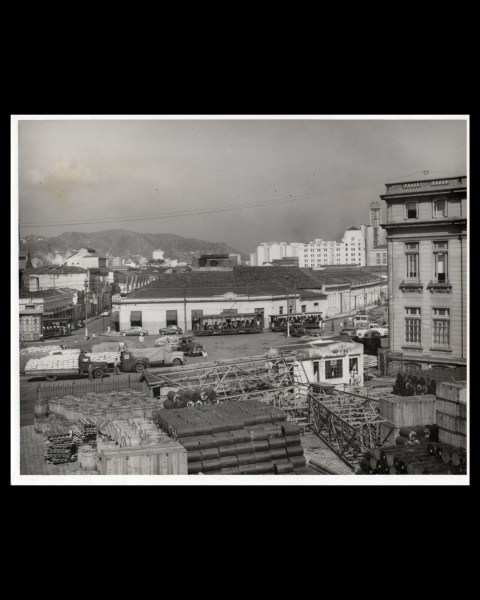 • fotografia - Santos - São Paulo - Área do terminal rodoviário da principal cidade portuária do Brasil. À direita, uma esquina da Aduana (Alfândega) - foto original - verso com as informações em inglês - em ótimo estado de conservação - (20,5x25,5)cm.