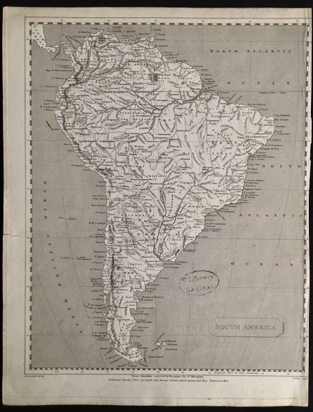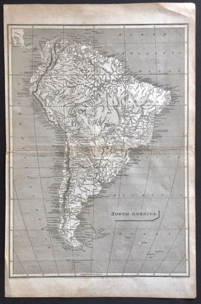 • mapa - South America - Arrowsmith direxit - Lowry sculp. -1802 - Cadell and Davies - papel brm conservado - imagem (24,5X19,5) com as margens (28,3X21,8) cm. - margem direita estreita  - pequeno rasgo nocentro da margem esquerda.