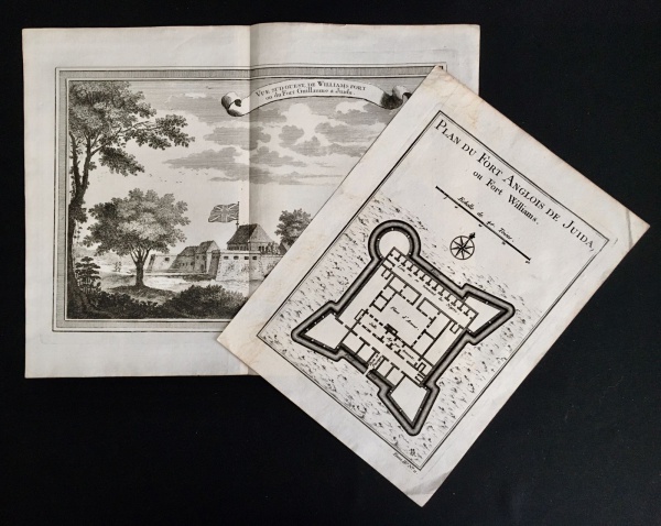 • gravura - conjunto de 2 itens - Vue Sud Ouest De Williams Fort Ou Du Fort Guillaume A Juida e Plan du Fort Anglois de Juida ou Fort Williams - J. Van Schley - 1748 -Gravura em metal - a maior com dobra no centro da página dupla do livro - em bom estado de conservação - apenas levemente amarelada - tamanho da folha (25,5X32,5) cm e (25,5X19) cm.
