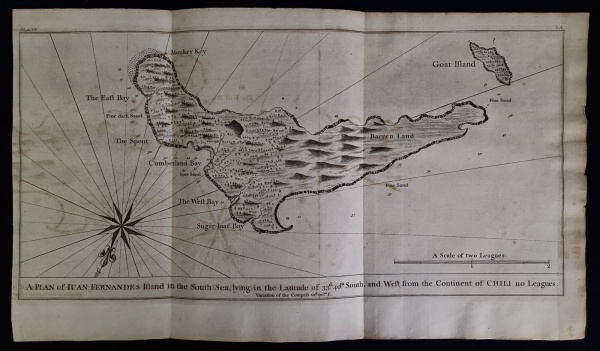 • gravura - A Plan of Iuan Fernandes Islannd in the South Sea.........West from the continent of Chili - Anson George (1697-1762) - Published by W. Bowyer- 1776 - gravura pertencente a obra Voyage Round the World - papel amarelado  - 2 marcas de dobra vertical - (29,3X 52) cm.