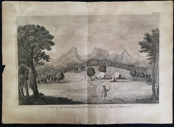 • gravura - A View of the Commodores Tent at the Island of Juan Fernandes - J. Mason sculp. - Anson George (1697-1762) - Published by W. Bowyer- 1776 - gravura pertencente a obra Voyage Round the World - papel amarelado  - marca de dobra central vertical - borda lateral esquerda levemente danificada  - (29,3X 41) cm.