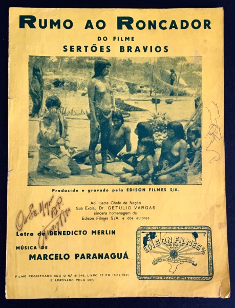 • partitura - Rumo ao Roncador do filme Sertões Bravios - letra de Benedicto Merlin - musica de Marcelo Paranaguá - Graf. Irmãos Vitale - 4 p. - com marcas do tempo - pequeno rasgo na ultima folha -  assinatura do maestro Marcelo Paranaguá na última pagina -  (30,5X23) cm.