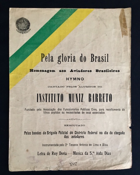 • partitura - Pela Gloria do Brasil - Homenagem aos Aviadores Brasileiros - letra de Ruy Doria -musica de Aída Dias - 1927 - Off. Tp. Instituto Muniz Barreto - 4p. - com marcas do tempo - (31,5X24) cm.