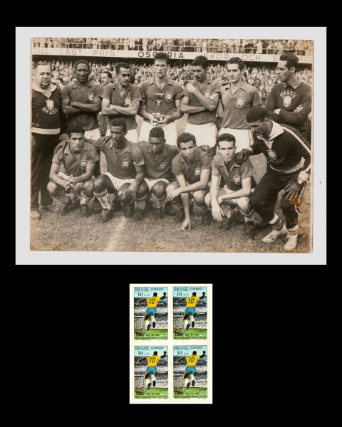 • futebol - PELÉ - fotografia original Copa do Mundo 1958 - com marcas do tempo - (24x18)cm. - acompanha quadra de selos do Milésimo Gol de 1969.