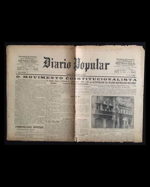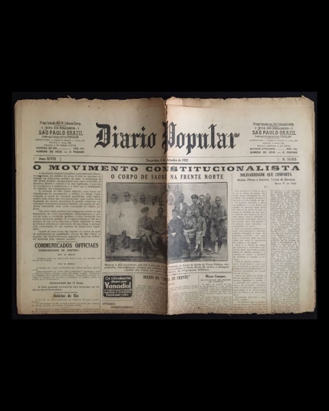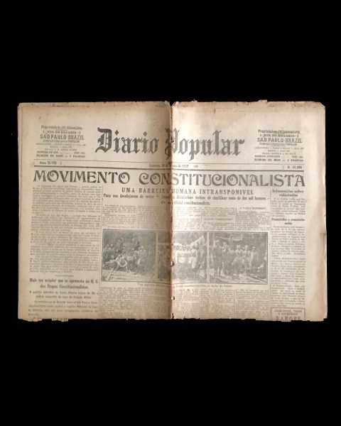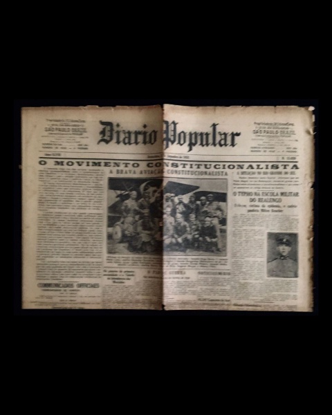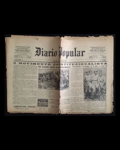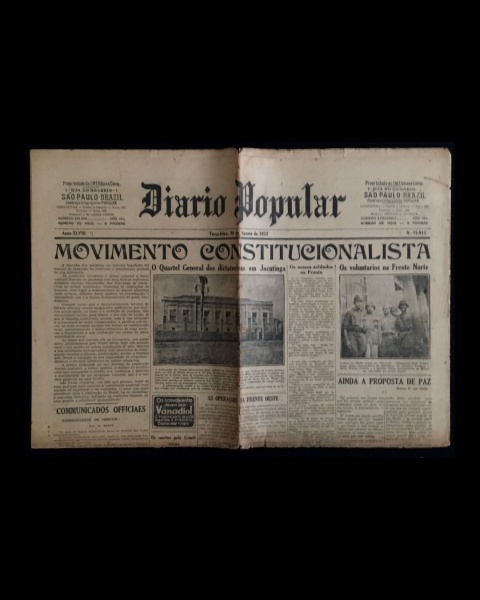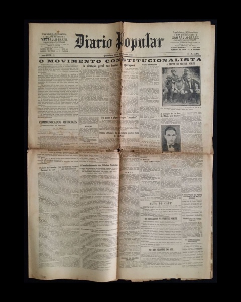 • jornal - Revolução de 32 - Diário Popular - anno XLVIII - 20 de agosto de 1932 - nº 15909 - J. M. Lisboa Junior(director) - 8 p. - papel amarelado e quebradiço - marcas de dobras escurecidas e danificadas - (60x43)cm.