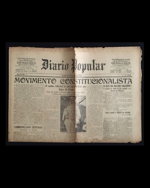 • jornal - Revolução de 32 - Diário Popular - anno XLVIII - 22 de agosto de 1932 - nº 15910 - J. M. Lisboa Junior(director) - 6 p. - papel amarelado e quebradiço - marcas de dobras escurecidas e danificadas - (60x43)cm.