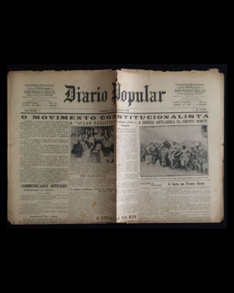 • jornal - Revolução de 32 - Diário Popular - anno XLVIII - 13 de setembro de 1932 - nº 15929 - J. M. Lisboa Junior(director) - 6 p. - papel amarelado e quebradiço - marcas de dobras escurecidas e danificadas - (60x43)cm.