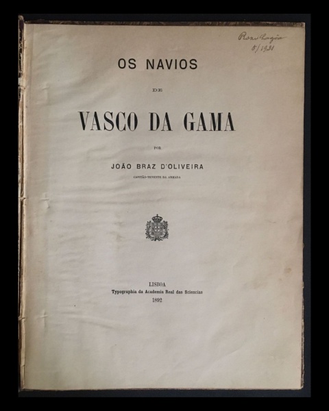 • livro - Os Navios de Vasco da Gama - João Braz D` Oliveira - Typographia da Academia Real das Sciencias - 1892 - 28 p. - assinatura datada 5/1921 no alto da folha do rosto - encadernação antiga com desgastes do tempo - miolo amarelado - (28,5x21,5)cm.